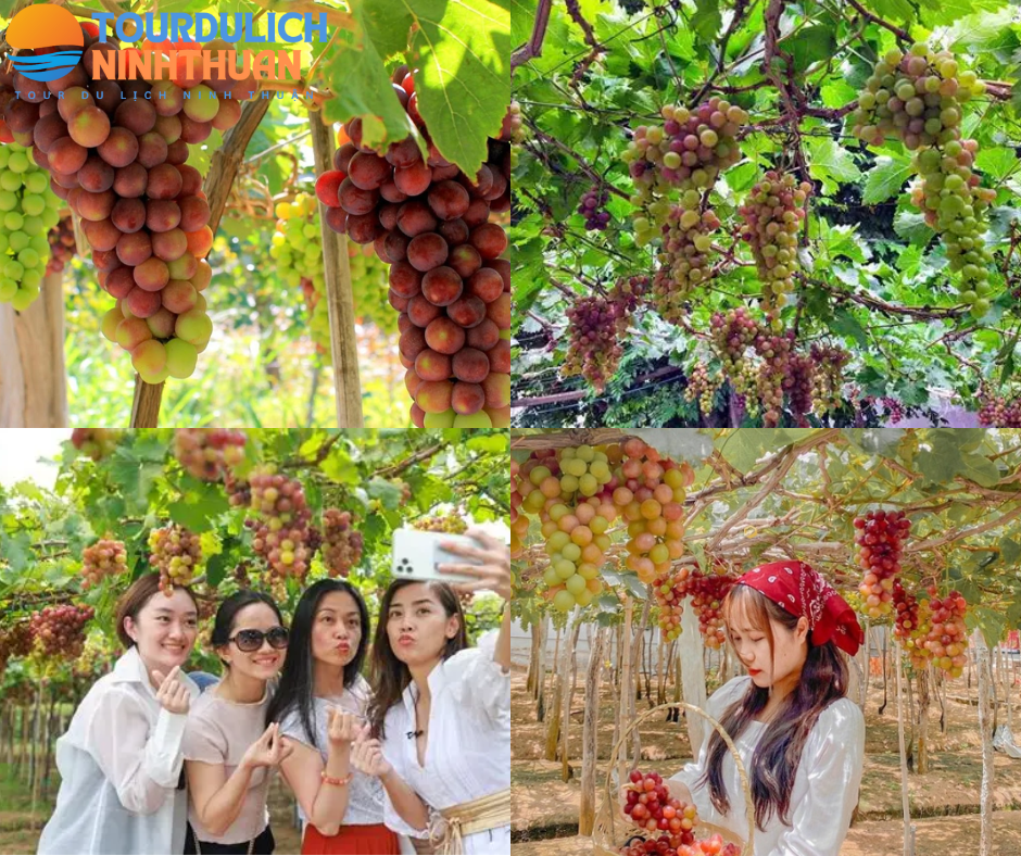 - Vườn Nho Thái An: Quý khách có thể tản bộ giữa những giàn nho trĩu quả và tự tay hái những chùm nho chín căng mọng. Từng trái nho mang vị ngọt thanh xen lẫn chút chua nhẹ, phản ánh đặc trưng của vùng đất nhiều nắng và gió Ninh Thuận.