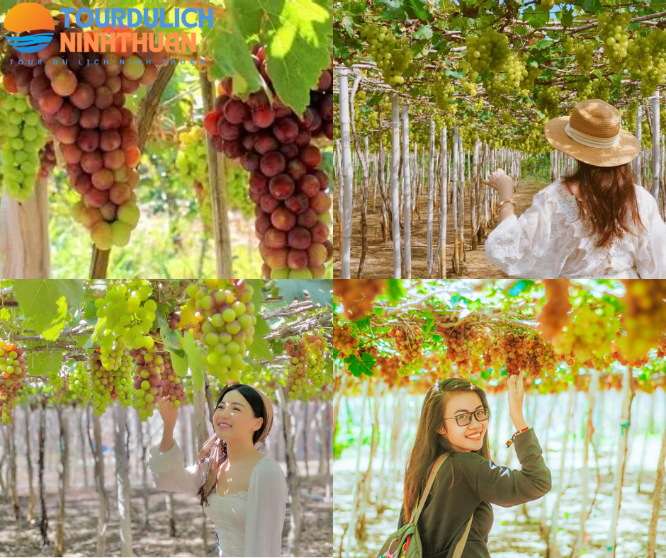 - Vườn Nho Ninh Thuận: điểm cuối trong hành trình khám phá Ninh Thuận, quý khách có cơ hội trải nghiệm văn hóa nông trại đặc sắc. Tại đây, quý khách có thể tham quan vườn nho xanh mướt, thưởng thức sản phẩm chế biến từ nho như rượu vang, mứt và các đặc sản địa phương...