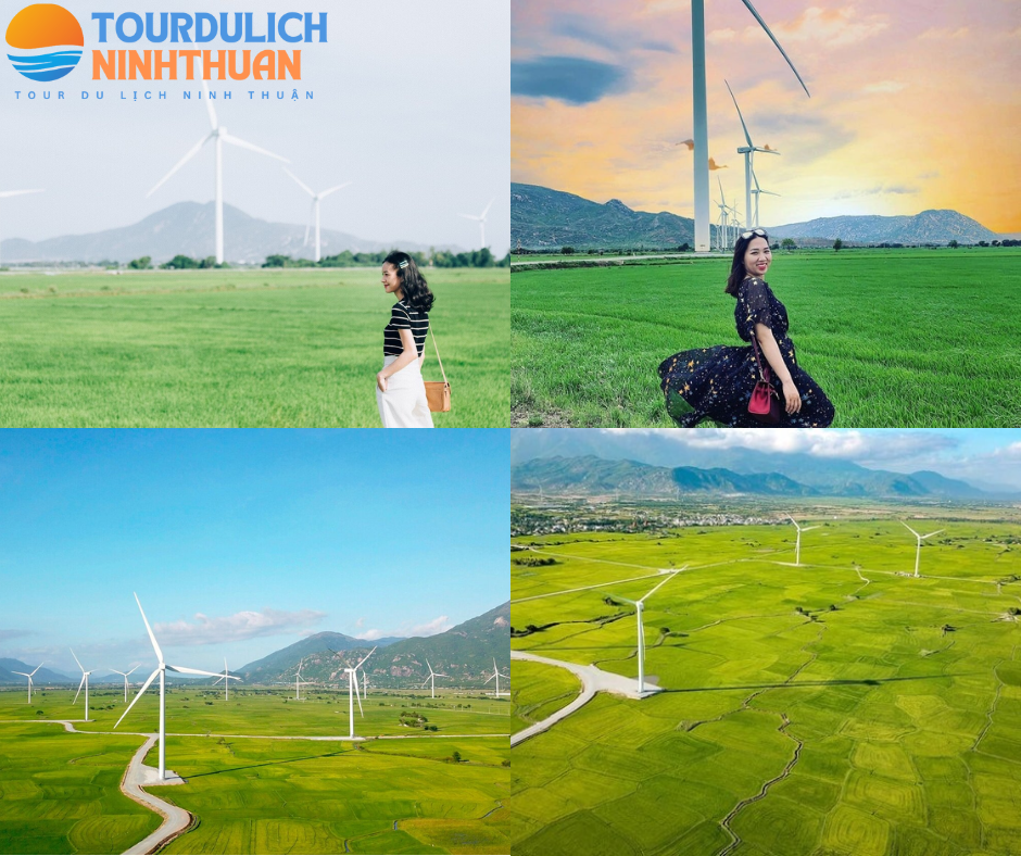 Cánh Đồng Điện Gió Đầm Nại: Những trụ tuabin khổng lồ sừng sững giữa nền trời trong xanh, quay đều trong làn gió biển mát rượi, tạo nên khung cảnh vừa mạnh mẽ, vừa nên thơ.